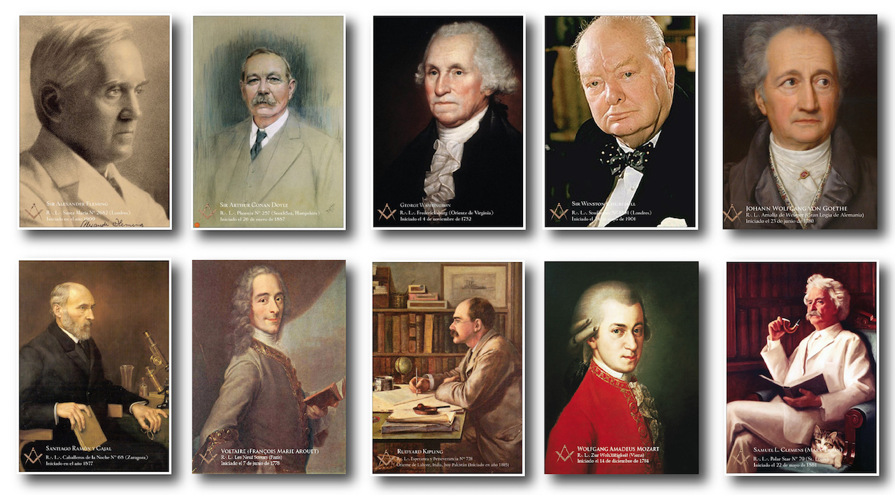 Conjunto de 10 postales masónicas en tamaño estándar, con reproducciones de personajes históricos pertenecientes a la colección «Masones a la gloria de la Humanidad», realizadas en formato tradicional de correspondencia.