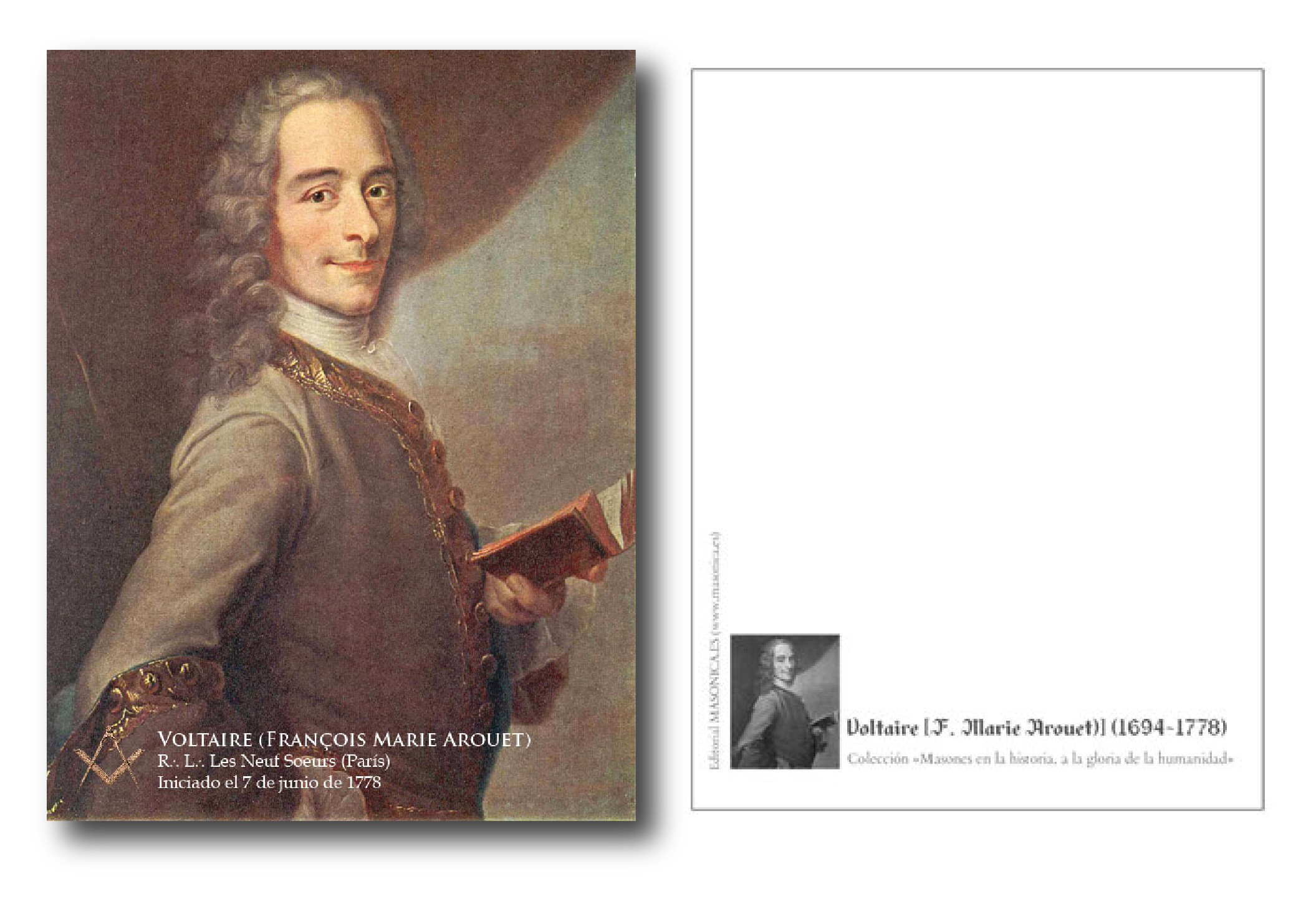 Voltaire, François-Marie Arouet, fue iniciado en la masonería el 7 de abril de 1778 en la logia parisina Les Neuf Sœurs. Su ingreso en la Orden coronó una vida dedicada a la razón, la tolerancia y la libertad de pensamiento, principios que lo convierten en una de las figuras intelectuales más emblemáticas de la Ilustración.